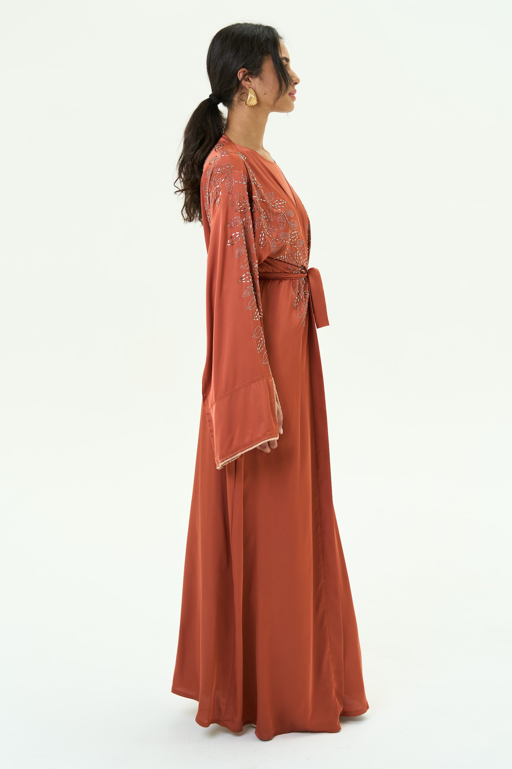 Confectionnée à la main dans nos ateliers de Dubaï, l’abaya Khaleej est une pièce qui allie originalité et élégance. Sa teinte orange vibrante, à la fois audacieuse et raffinée, illumine le teint et apporte une touche de modernité à votre dressing.